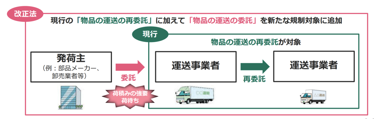 物流問題に対応するため、新たに「特定運送委託」が法の対象に追加されます。これにより、貨物運送事業者(トラック事業者等)が荷主から受ける運送委託も、資本金や従業員数の要件を満たせば法の保護対象となります。