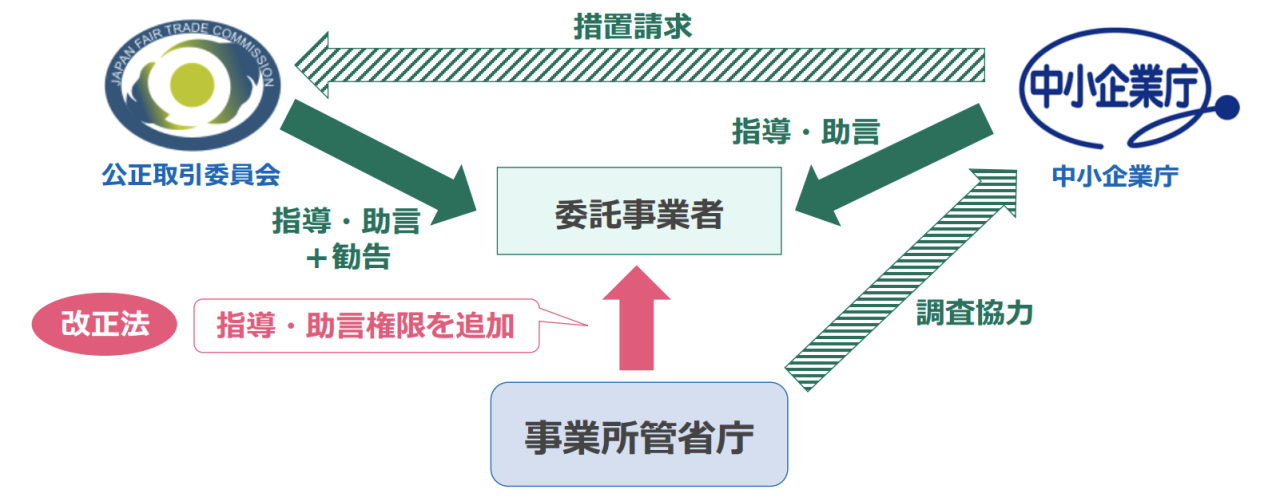 これまでは公正取引委員会が主務官庁でしたが、改正後は事業所管省庁(経済産業省、国土交通省など)も、違反の恐れがある委託事業者に対して指導・助言権限が付与されます。これにより、より広範で迅速な監督・執行体制が期待されます。