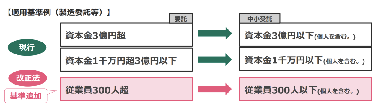 従来は資本金のみで委託事業者(親事業者)の範囲を定義していましたが、新たに「常時使用する従業員数」の基準が追加されます。