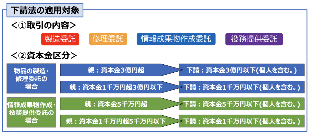 適用基準は、事業者の資本金規模と取引の類型で判断されます。対象となる取引は主に、製造委託・修理委託・情報成果物作成委託・役務提供委託の4類型に分類され、それぞれに資本金基準が設けられています。