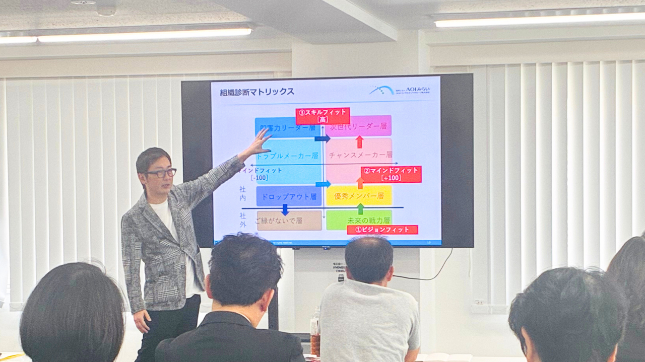 最初のセッションでは、組織づくりの根幹となる「MVV(ミッション・ビジョン・バリュー)」と「人事評価制度」についてお話ししました。かつてのAOIみらいは、即戦力を求めてスキル重視の採用を行っていました。確かに仕事はできる人が入ってきます。しかし、会社の方向性や大切にしている価値観と合わない人材が入ることで、組織に歪みが生じてしまうこともありました。